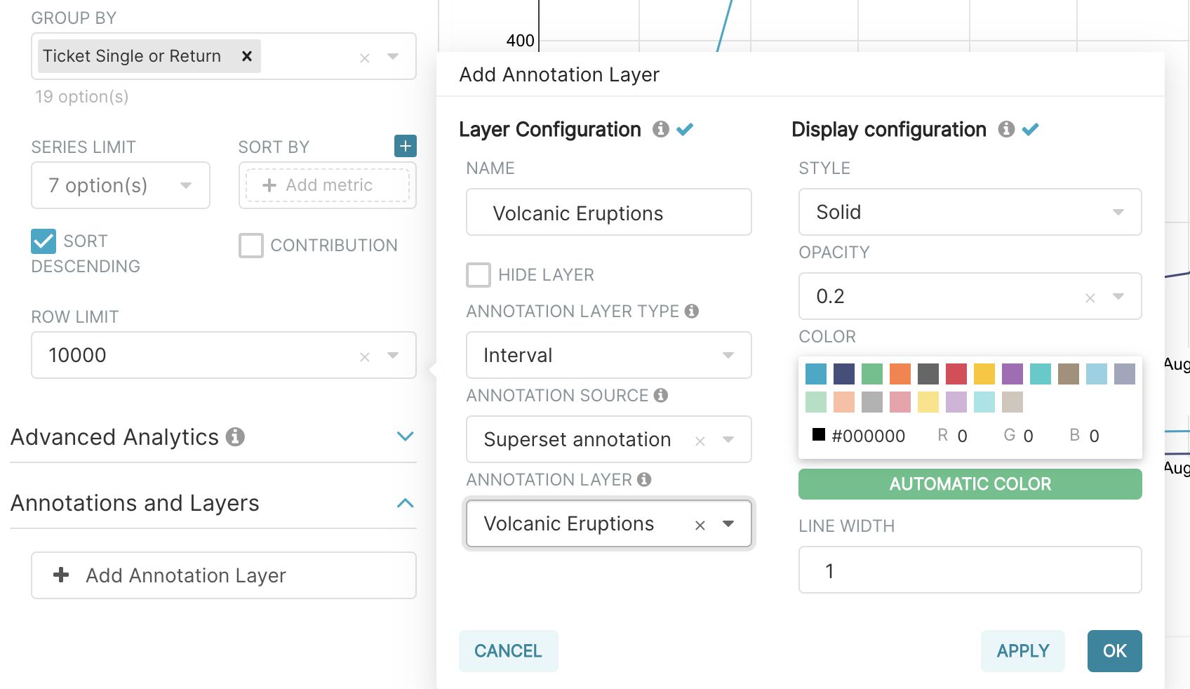 Then, navigate to the line chart by going to Charts then selecting Tutorial Line Chart from the list. Next, go to the Annotations and Layers section and select Add Annotation Layer. Within this dialogue: